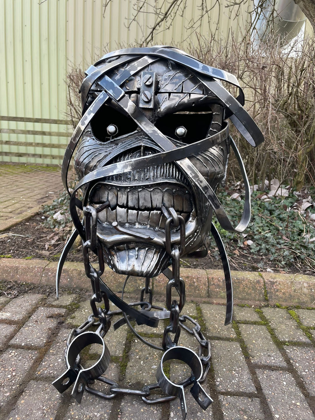 The Iron Maiden Powerslave Wood Burner and Grill is made in the likeness of Eddie the Mummy. complete with his crown hinged to open up and reveal a coal and BBQ grill. The rear hatch allows for easy fire tending. making this fire pit as functional as it is impressive. Eddie's cuffs and heavy-duty chain link base form the stand. while the ultra-high temperature clear coat gives it a sleek finish. The dimensions of this masterpiece are approximately 44 x 44 x 75cm.