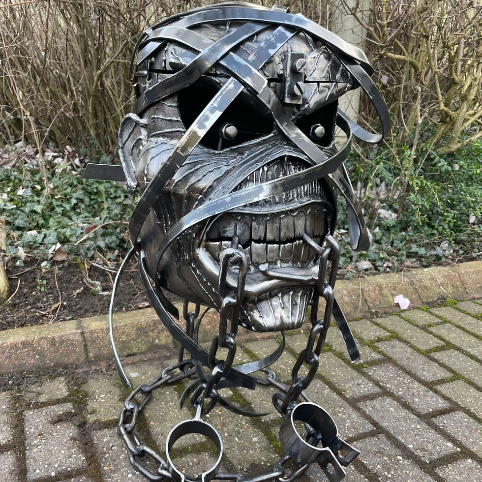 Iron Maiden's iconic mascot Eddie has graced everything from t-shirts and mugs to video games and pinball tables. But now. thanks to our head craftsman Alex. and Burned by Design becoming manufacturers of official Iron Maiden merchandise. Eddie has been immortalised as a wood burner and grill. This handmade masterpiece of a fire pit is a tribute to the Powerslave era. with intricate attention to detail that will delight any Iron Maiden fan.